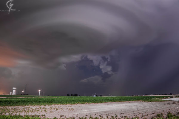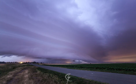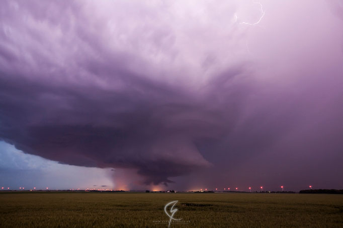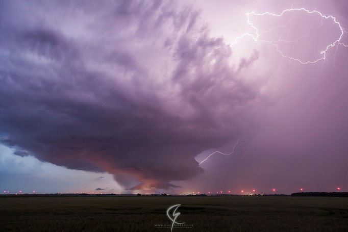 Nuit du 9 juin 2014 exceptionnelle avec une magnifique supercellule. Sur ces deux clichés, nous pouvons apercevoir le mesocyclone avec son nuage-mur. Il est très bien dessiné et très imposant. Cette supercellule donna des grêlons de plus de 9 cm entre Chartres et Orléans et l'activité électrique fut très intense.