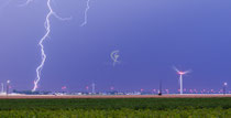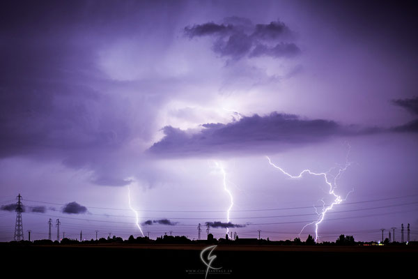 Inédits de la nuit du 25 juillet 2013 en région Centre. Triple impact en périphérie d'une supercellule (à gauche) et mésocyclone (à droite) très visible et éclairé par des impacts de foudre qui sous cet aspect là (soucoupe) reste une photo rare en Europe.