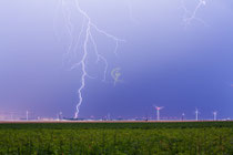Impact de foudre touchant un arbre et produisant deux power flash sur deux poteaux électriques (à gauche et à droite de la photo). Situation très électrique le 25 juillet 2013 en région Centre. La première photo est l'originale et la seconde un crop (zoom de la précédente).